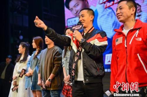 资料图:主演韩庚向现场热情粉丝“比心”。 钟欣 摄