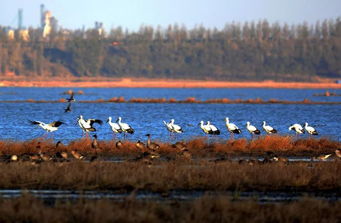 千只白鹤白鹳停歇卧龙湖 上下飞舞 场面壮观
