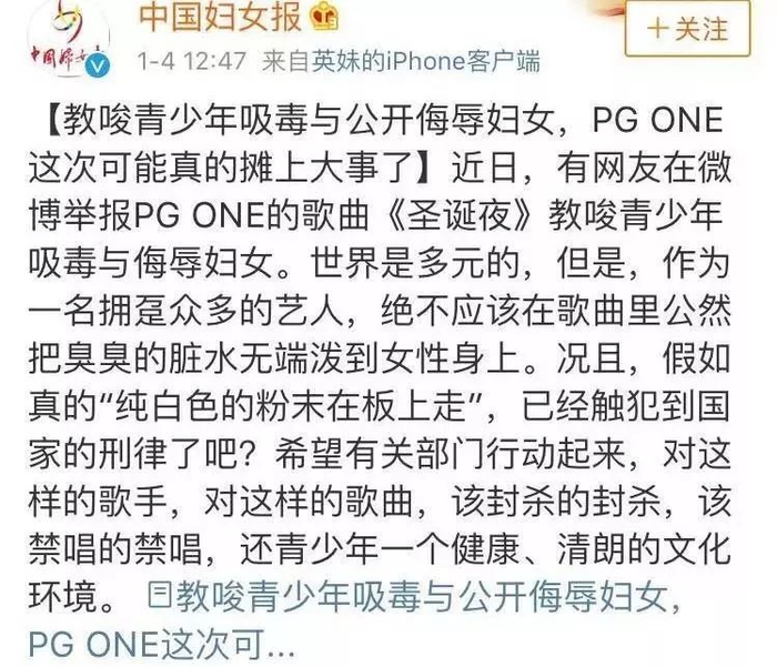 4日,《中国妇女报》发表特约评论员文章,直指《圣诞夜》歌词“教唆青少年吸毒与公开侮辱妇女”,文章写道: