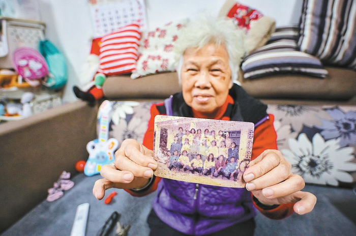 江惠群向记者展示的这张彩色照片是她当年和工友们一起在宿舍门口拍摄的。