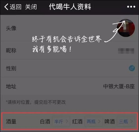 怀着对这项“神服务”的好奇,韩国记者还在中国特地体验了一番。据《中央日报》报道,4日晚,韩国记者办公室所在的北京市中心建国门一带,记者尝试使用了该软件。建国门这附近还不算娱乐区域,但在半径400米以内地图上跳出10名代喝人的位置。记者在点击其中一名代喝人后立即弹出他的自我介绍——“奥运会金牌级喝酒选手”,“酒量是白酒两瓶、啤酒一箱”。