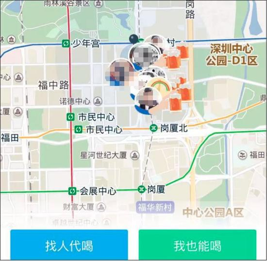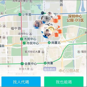 用户在软件中输入或设置自己的位置,手机画面的地图上就会显示出附近的 “代喝人”。这些“代喝人”在提供“代喝”服务之前,会提前在软件上的个人信息中写明自己的酒量、喜欢的酒类以及性别等基本信息。无论是谁都可以成为代喝人。