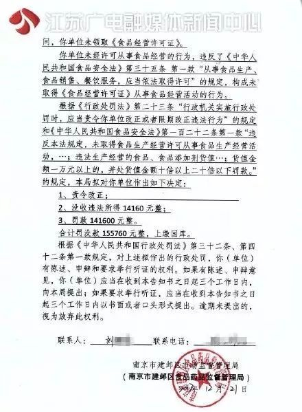 南京市建邺区市场监管局沙洲食药监所负责人说:“不要跟我谈凑钱,你那白纸黑字的东西都在这里,我跟你讲,有问题!你要跟我狡辩,我们之间免谈。不交?按二十倍处罚……我们就等你告我们。”