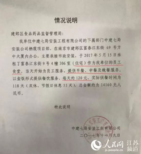 ▲中建七局安装工程有限公司在情况说明中承认此处为员工食堂(图片来源:人民网-江苏频道)