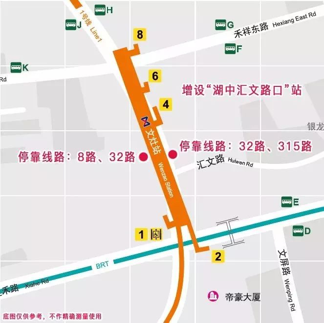 (一)在湖滨中路增设一对“湖中汇文路口”站,距离轨道交通1号线文灶站出入口约100米,调整32路(双向)、8路(往第一码头方向)、315路(往莲花三村方向)等3条线路增停。