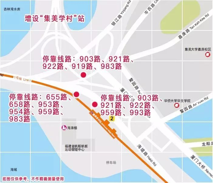 (三)在海堤路增设一对“集美学村”站,距离轨道交通1号线集美学村站出入口约100米,调整655路、658路、954路等3条线路进岛方向单向增停,903路、921路、922路等3条线路双向增停。
