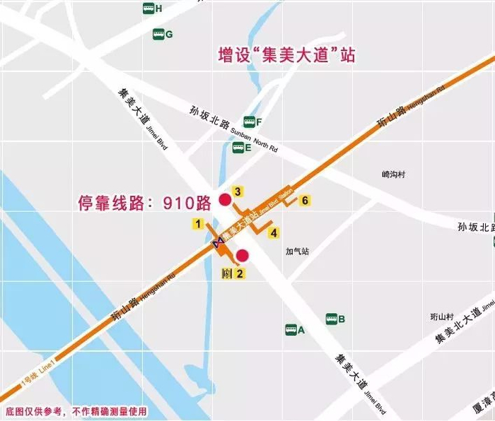 (六)在集美大道增设一对“集美大道”站,距离轨道交通1号线集美大道站出入口约50米,调整910路双向增停。