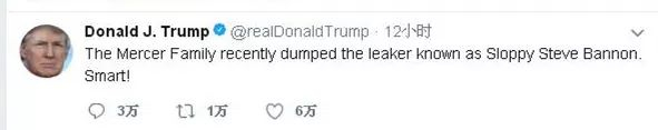 据报道,班农曾在私下里说,如果他竞选总统,默瑟家族会支持他。特朗普5日发推特说:“默瑟家族抛弃了泄密者史蒂夫·班农,聪明!”