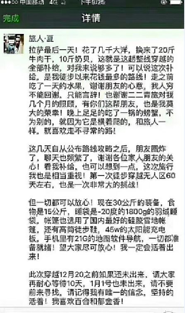 “这可能是最后一次朋友圈了,如果成功,我们两个月后见!加油!旅人!”