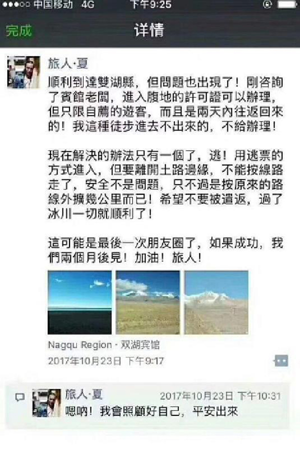 去年10月23日晚9点17分之前,驴友刘银川(微信名“旅人·夏”)在朋友圈留下这两段留言,就从西藏双湖县出发,开始徒步穿越阿尔金山、可可西里和羌塘无人区。