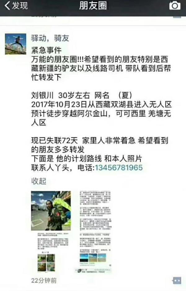 原题为《驴友“独闯”阿尔金山无人区失联70多天 家人急发“寻人帖”》