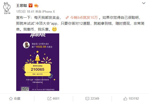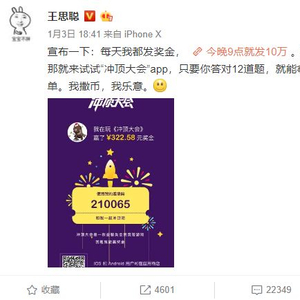 “我撒币,我乐意。”1月3日,王思聪在他30岁生日这天在微博宣布拿出10万元给冲顶大会当作奖金。