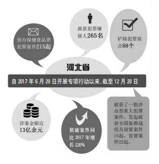 这些都是河北省公安机关开展打击保健食品违法犯罪专项行动中的典型案例。记者从河北省公安厅获悉,自2017年6月20日开展专项行动以来,截至2017年12月20日,河北省共侦办保健食品类犯罪案件215起,抓获犯罪嫌疑人265名,铲除犯罪窝点68个,涉案金额近13亿余元,侦破案件同比去年增长220%;破获了一批涉众型重大犯罪案件,发起破获全国集群战役及部督案件15起,省督案件22起。
