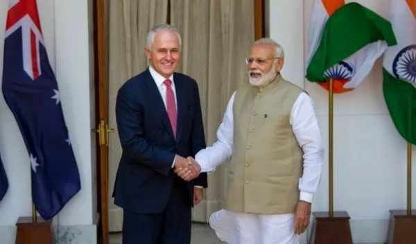 ▲资料图片:2017年4月10日,印度总理莫迪(右)在新德里会见了澳大利亚总理特恩布尔。(《澳大利亚金融评论报》)