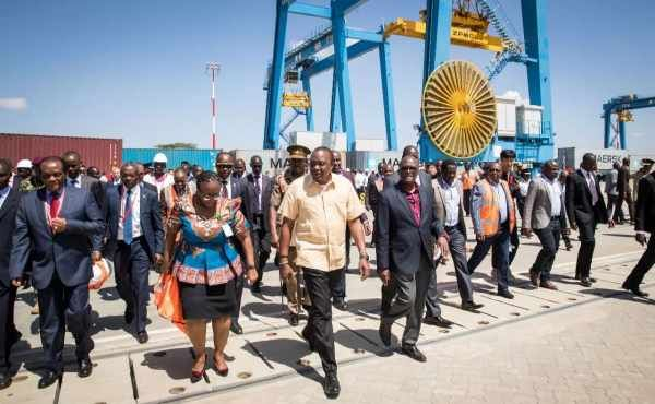 ▲资料图片:2017年12月16日,在肯尼亚首都内罗毕,肯尼亚总统肯雅塔(前中)视察由中企承建的内罗毕内陆集装箱港。