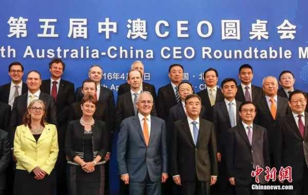 ▲资料图片:2016年4月15日,第五届中澳工商界首席执行官圆桌会在北京举行,中国国务院副总理汪洋(前排右三)与澳大利亚总理特恩布尔(前排左三)共同会见与会企业家。
