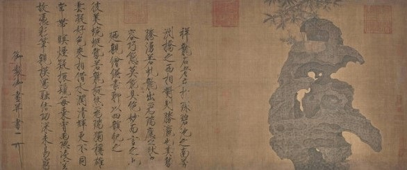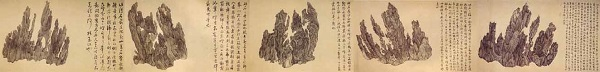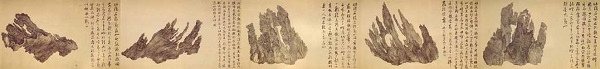 古人对石头情有独钟,赏石之风盛行,这些天地精气结成的奇石也经常成为画家描绘的对象,被画入图中,以便主人作长久的赏玩或向亲朋知交们炫示。在中国,奇石的收藏可以追溯到汉代。在唐代,著名诗人白居易喜爱太湖石,并撰文《太湖石记》,此文章成为了研究太湖石收藏、鉴赏重要的文献。到了北宋,米万钟的先祖米芾爱石如痴如癫,见到奇石竟跪倒下拜。宋徽宗的皇家园林艮岳里陈列了各样异石,他对其中一块名为“祥龙石”尤为迷恋,绘有《祥龙石图卷》以留念。祥龙石今日已不得见,但画卷珍藏于北京故宫博物院。此时,也开始流行为石配图,制成石谱,如杜绾《云林石谱》、渔阳公《渔阳石谱》、常懋《宣和石谱》等,到明代林有麟《素园石谱》最称完备。
