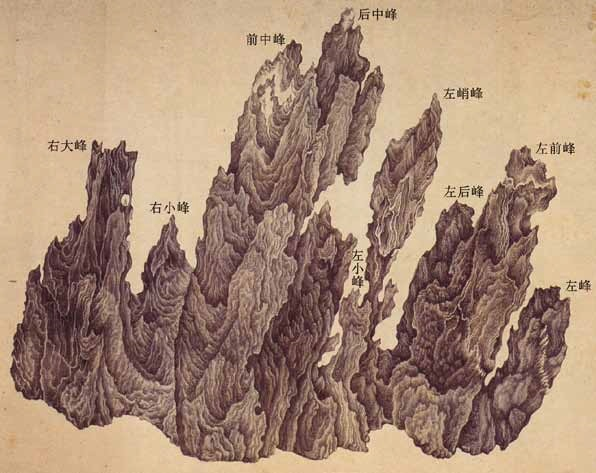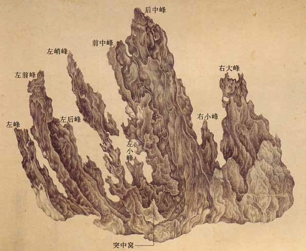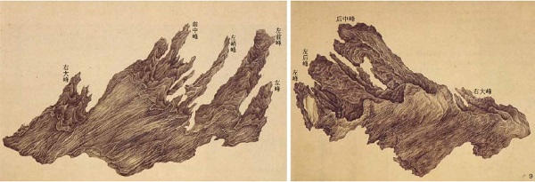 卷首第一幅是非非石的正面。此石共有九峰,如《春明梦余录》所说“非非石,数峰高耸,俨然小九子也”。两座中峰最高,居中耸立;左边五峰,右边两峰,形成拱卫之势。前中峰高一尺七寸,山间突起十余座小峰,形态最丰富;中部最高最大者为主干,侧向又分出三枝:左前方较低处的一座山峦,后面对着后中峰矗立一根天柱,左侧还有一枝倾斜的小峰。后中峰高一尺九寸,岿然立于其后,宛然众峰之主。左前方的一座小峰,高仅六寸八分,顶端分为三岔。诸峰中最神奇的是左边那座峭峰,高一尺六寸,顶部尖锐如锥,姿态欹斜若醉,细瘦宛转的腰部,不堪盈盈一握,米万钟将其比喻为“如西子出浴,弱不胜衣;又如飞燕舞掌,狂不自定”。其左山峰分为前后两股,前峰高一尺三寸五分,后峰高一尺一寸五分,微微斜向左侧,但顶部则拱中而立,呼应着主峰。最左边以一座更低的山峰收束。右侧仅有两峰,一小一大,最右侧的大峰上部有一处孔洞,露出后面的山尖,令米氏啧啧称奇。非非石以瘦、皱为主,有此一孔,又可添一“透”字。此外,作为灵璧石中的上品,这尊非非石在音效方面也有其独到之处,大小九个峰头,“各具一响,扣则八音迭奏”,与奇异的姿态结合,使观者得以尽享耳目之欢。