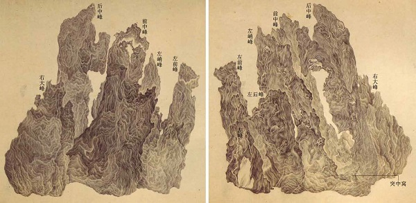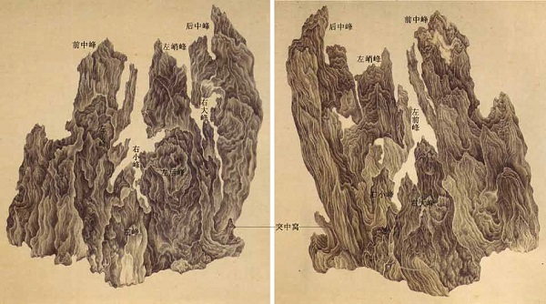 左:吴彬《十面灵璧图》第三图:左正面。右:吴彬《十面灵璧图》第四图:右正面