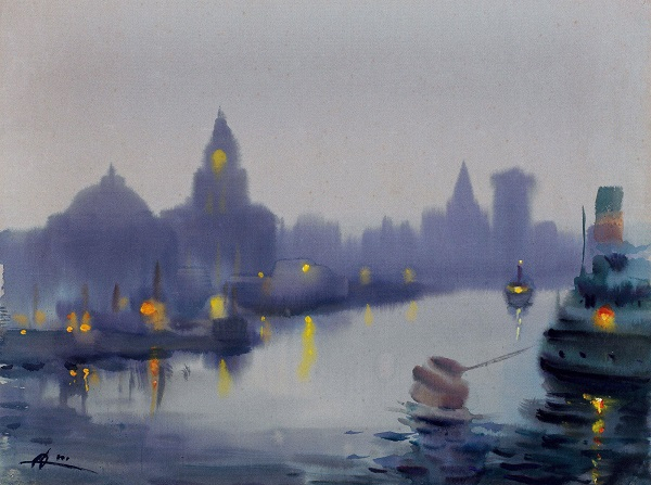 冉熙 《浦江夜色》 水彩 纸本