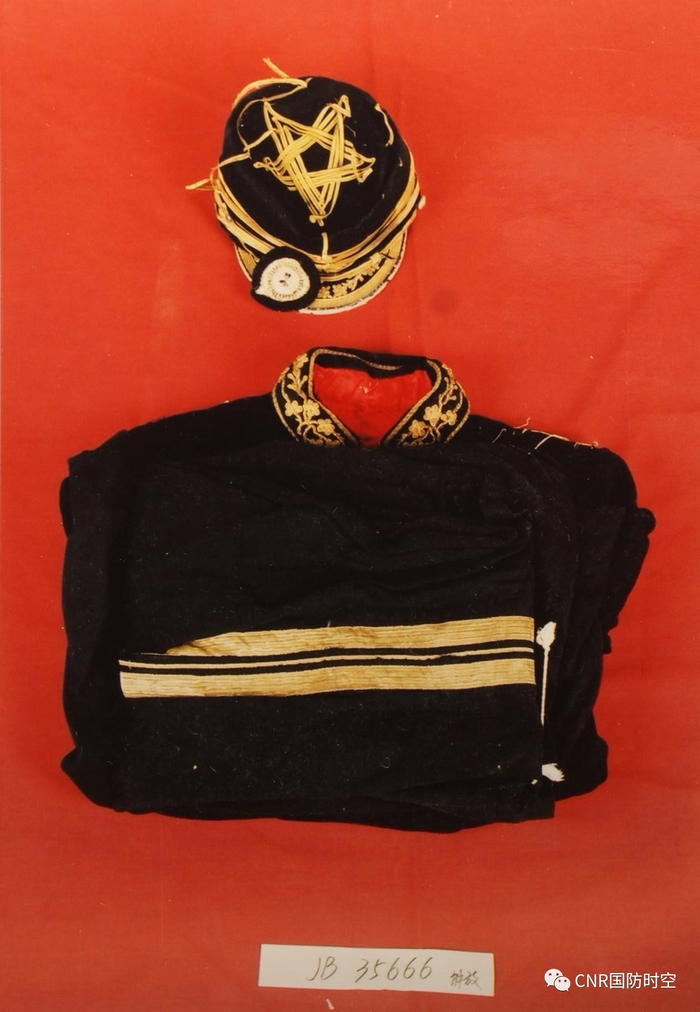 这是一套黑色呢质的国民党陆军三星上将军服,帽沿上方缀有青天白日徽章,帽顶有金丝带组成的五角星,帽周饰有很细的金丝带;肩章上钉有 3个“三角星”,顶端为梅花标志,垂饰铜丝穗;上衣领周饰有金质梅花,双袖各配 3道金丝饰带与金丝梅花,7只铜质梅花襟扣,双袖各配有3个金丝饰扣;裤子两侧各有两宽一细的3道金丝饰带;腰带外侧为含金丝饰,黄色的带扣为铜质珐琅,蓝底白梅。这套国民党陆军上将军服,是人民解放军在解放战争时期的兰州战役中缴获的。他的主人是国民党西北军政长官公署长官马步芳。