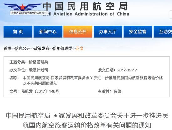 去年12月17日,中国民用航空局、国家发展和改革委员会联合发布《关于进一步推进民航国内航空旅客运输价格改革有关问题的通知》,《通知》指出: