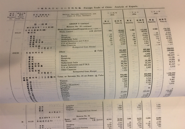 总体而言,这些书籍极具专业色彩,其中条分缕析十分细致,如果对应中国近代发生的重大事件关节点来看,似乎更具趣味。例如,仅仅在中日全面战争爆发前夕的1935-1937三年之间,中国罐头肉出口数据逐年攀升。其间,又以向香港、新加坡等地出口增长为最,在这每组数据背后都藏着历史隐秘有待解释。