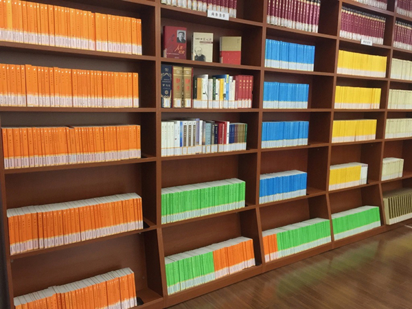 静安区图书馆二楼为报刊阅览室,工作日时间,许多附近的中老年居民都到此处阅报消闲。在四楼的中文图书借阅室中,一进门就能发现今天各大图书馆、书店的标配——全套的商务印书馆“彩虹书”整齐摆开来。