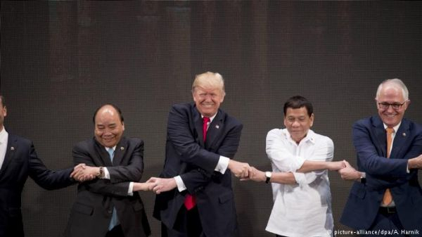 第31届东盟峰会在菲律宾开幕。美国总统特朗普(中)与菲律宾总统杜特尔特(右二)在峰会合影。(德国之声电台网站)
