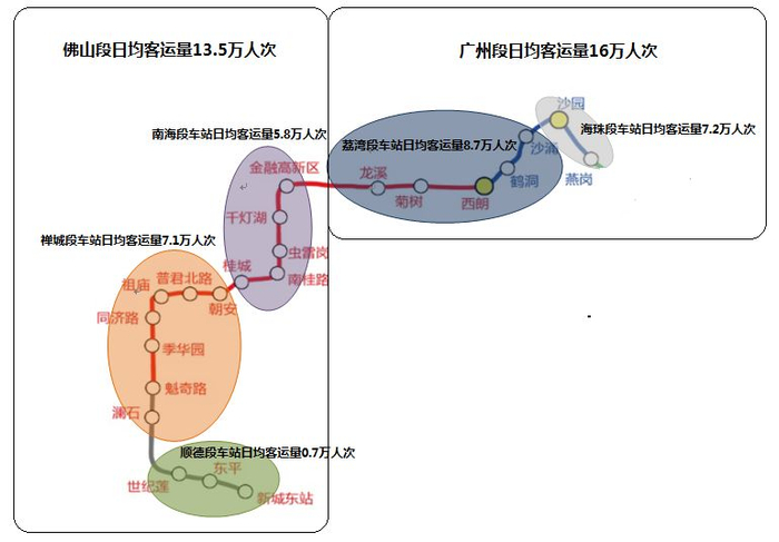 按行政区域统计,广州段各站客运量共计超5800万人次,占比54%,平均增幅约30%。其中,拥有5座车站的荔湾段客流量最高,为8.7万人次;海珠段虽然只有2个车站,但由于有换乘八号线的沙园站,日均客运量达7.2万人次。至于佛山段,各站客运量共计超4900万人次,占比46%,平均增幅约22%。