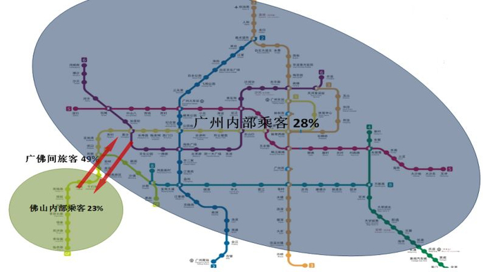 广佛地铁相关负责人说,作为城际地铁线路,按出行区域划分,广佛线的客流可进一步细分为城际间往来旅客以及市内出行乘客。2017年,广佛地铁继续发挥同城化加速器的作用,广佛城际间往来旅客、广州、佛山内部出行乘客中,仍以城际旅客为主,三部分各占比例分别为49%、28%和23%。
