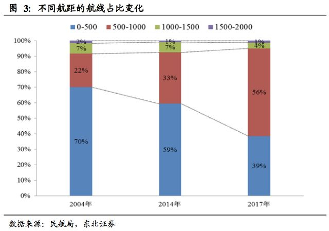 据统计,目前放开航线中,500公里以下航线占比39%,500-1000公里航线占比 56%,呈上升趋势,1000公里以上航线放开缓慢。