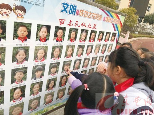 同学们观看“百名礼仪之星”展板
