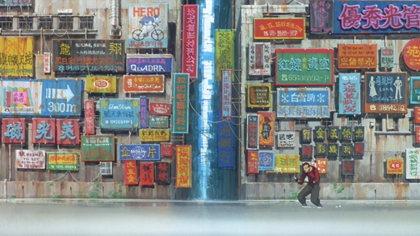 “原风景”指的是个人记忆深处故乡和童年所见的最初的风景,人们往往对其有着不可割舍的乡愁。科幻作者寻求一副未来图景时,并未幻想一个全新的世界,而是不约而同地挪用了亚洲的城市景观。拥挤、混沌、失范、神秘;汉字、竖排、霓虹、异域;旧世界的元素拼凑,构成了来自新世界的景观。“当我探寻一副未来景象时,首先进入脑海的就是一座亚洲城市……一个人要想忠实于动画制作方法的话,唯一的办法就是用真实的街道做模板,因此我想到了香港。”押井守如此描述《攻壳机动队》的取景过程。想象未来,便必须怀旧,于是,承载地形记忆的招牌成为无数人心中的原风景,在科幻文学中重生。