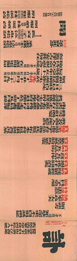 讣闻“高头大卷”,高四十八公分,长一百九十三公分。栗色竹纸,木板镂刻老宋体扁字,红黑双色套印。原件未加装裱。开首顶端大个“讣”字(足有十四公分高),左下角两行平列: