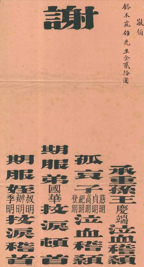 两张谢启,署款与讣闻大体一样,只缺了已殁的“潜明”。两纸右上端均楷书二行。一为“敬领铃木虎雄先生金贰拾圆”,一为“敬领铃木虎雄氏先生挽诗一通”。