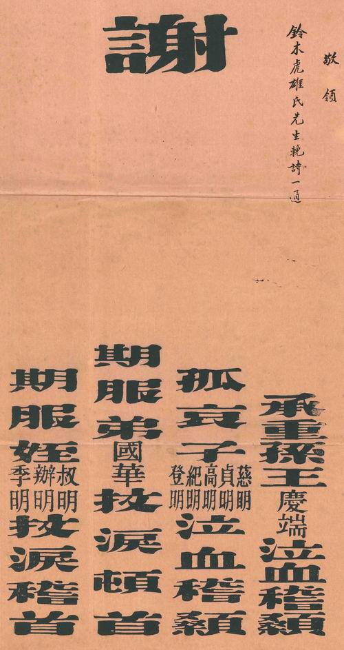 承重孙王庆端泣血稽颡,继慈命称哀,孤哀子慈明、贞明、潜(外加框反白字)明、高明、纪明、登明泣血稽颡。期服弟国华抆涙顿首。期服侄叔明、办明、季明抆泪稽首。