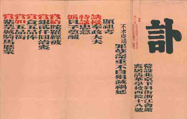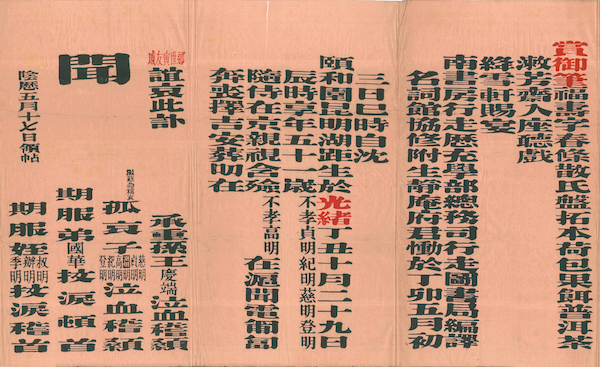 讣闻文中的“诰授”“特谥”“派”“赏给”“御笔”等字用朱印跳行抬头,是明显的古文书“罗伞式”。字体是仿宋式,横幼竖粗,更显庄严醒目。