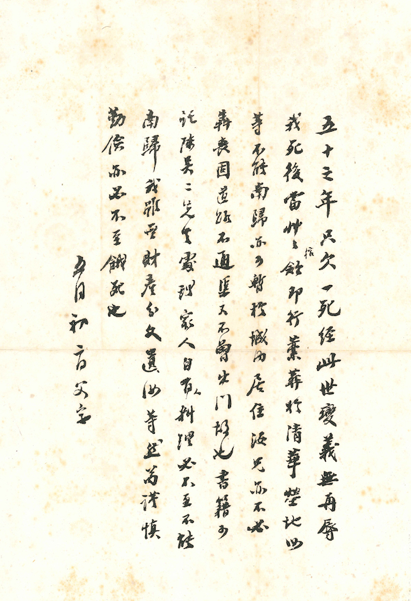 王氏遗嘱是石印的,泛黄宣纸上的斑点和浓墨,是广为流传的“五十之年,只欠一死,经此世变,义无再辱”。