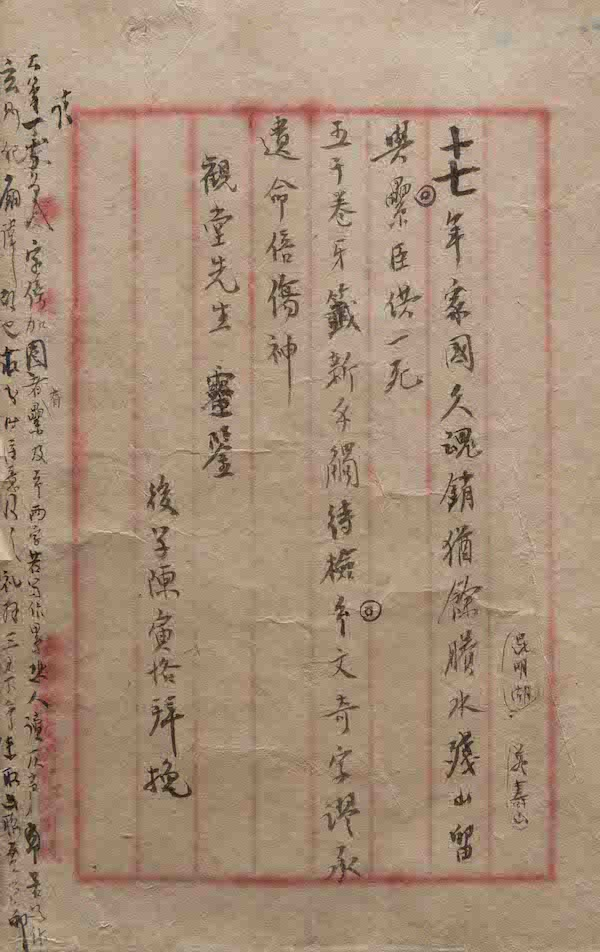 这是王国维在京都写寄与铃木虎雄的一小片邮柬(明信片),内容是订正前所录沈曾植秋怀诗的漏字,全文如下: