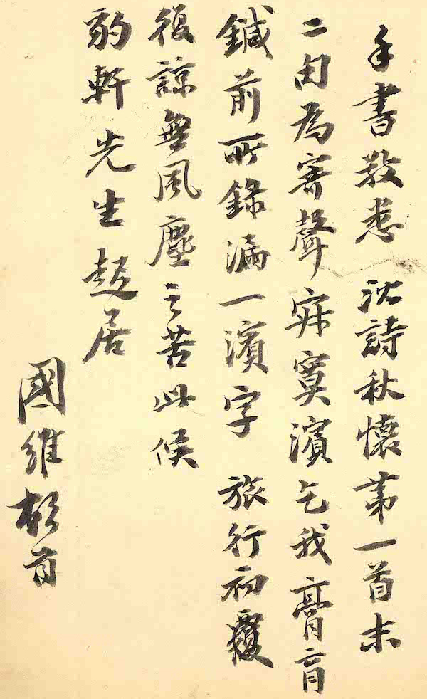 手书敬悉。沈诗秋怀第一首末二句为:寄声寂寞滨,乞我膏肓针。前所录漏一滨字。旅行初复,谅无风尘之苦。此候豹轩先生起居。国维顿首。