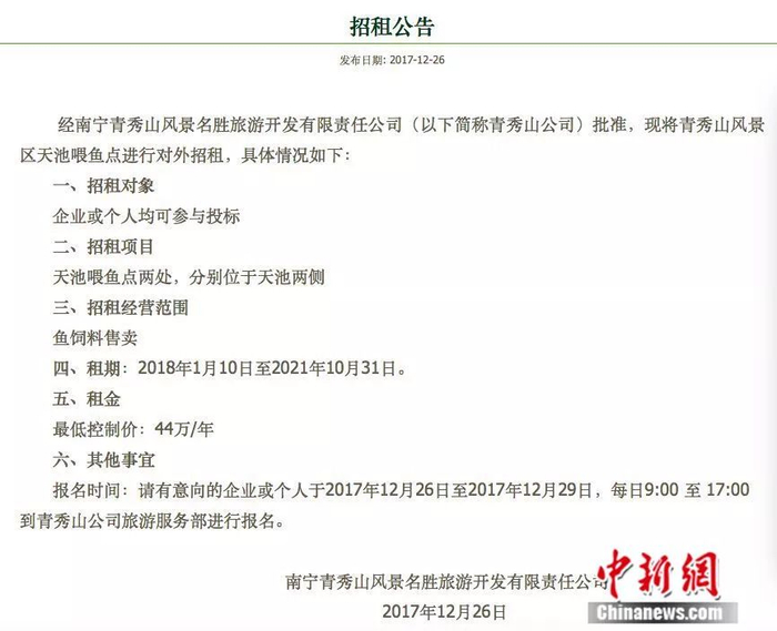 近日,广西一风景区喂鱼点招租年租金引起了大家热议网友惊呼“这不是累死售货员,就是撑死池中鱼。”这是怎么回事?
