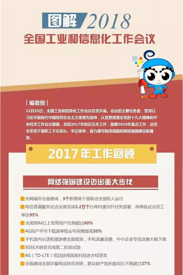 2018年,我国将进一步提升网络供给能力。加大网络提速降费力度。加快百兆宽带普及,推进千兆城市建设,实现高速光纤宽带网络城乡全面覆盖、4G网络覆盖和速率进一步提升、移动流量平均资费进一步降低、中小企业宽带和专线使用成本进一步下降。完善国际通信网络出入口布局,完成互联网网间带宽扩容1500G。推动三网融合全面展开。