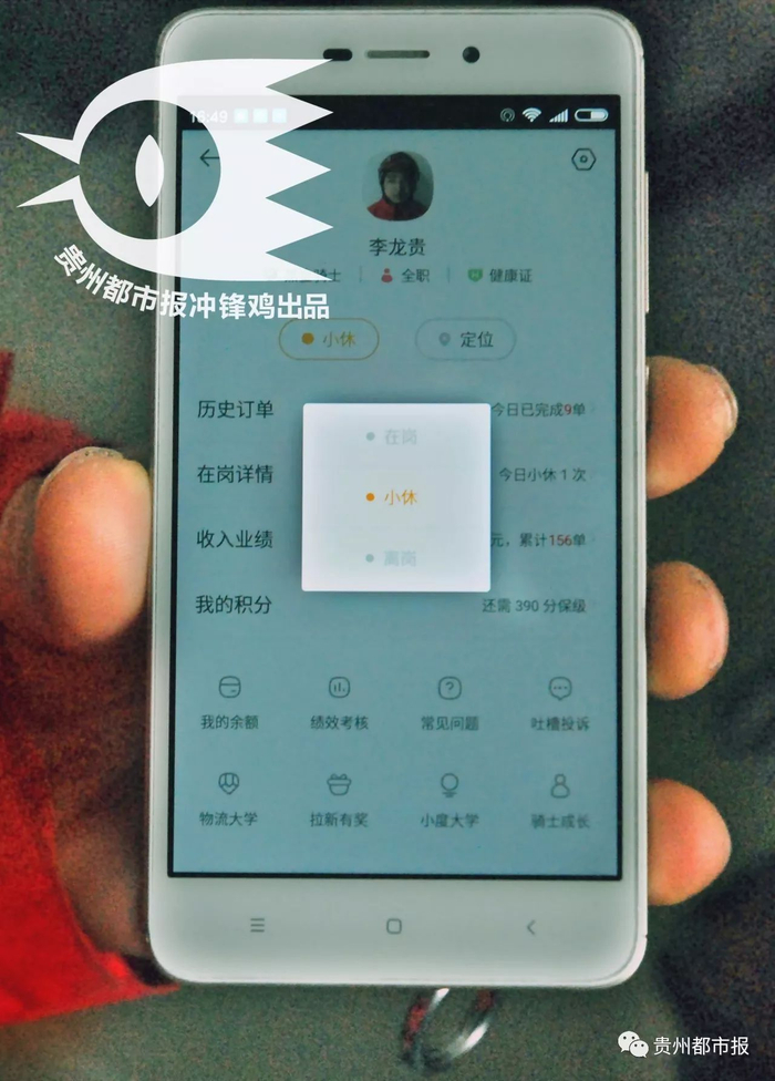 “送外卖,一怕顾客填错地址,二怕顾客不接电话。”有一次,客人填写的地址只有“贵州省人民医院”几个字。东西送到了,找不到人,电话也不接。眼看其他单要超时,李龙贵只得请公司调度备注“顾客不接电话”,先送别的单。这时,那名顾客打来电话:“我一直在等,你怎么超时了还不来?我要投诉你了。”李龙贵一边解释,一边赶紧送过去。“原来她是一名护士,手机调成静音了。看到之前给她打的几次电话,她连连道歉。”