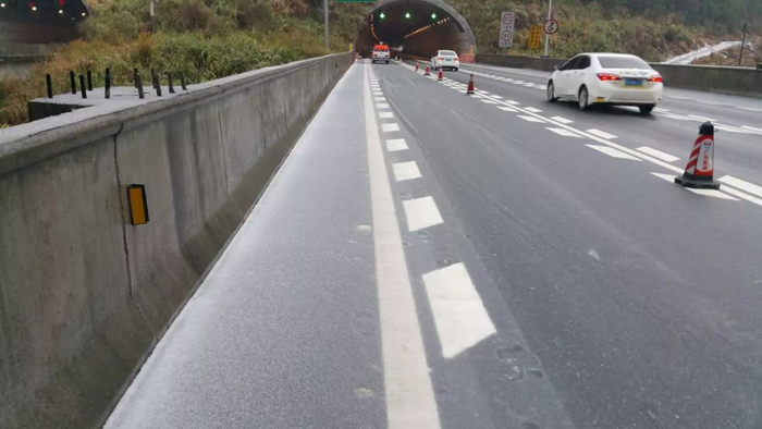 广乐高速路面出现雨加冰天气,路肩冰雪厚度最深达5厘米。