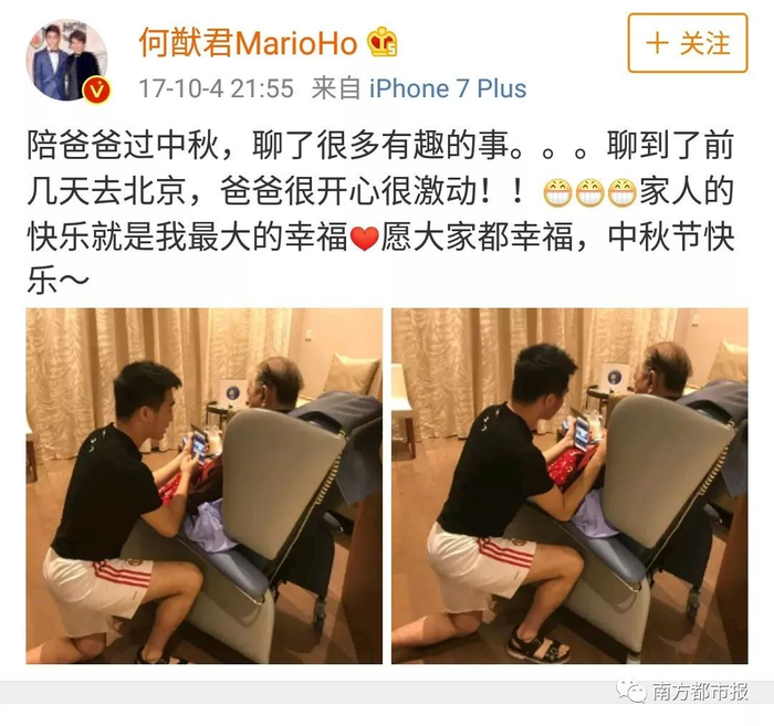 从微博来看,何猷君对父亲还是非常孝顺的: