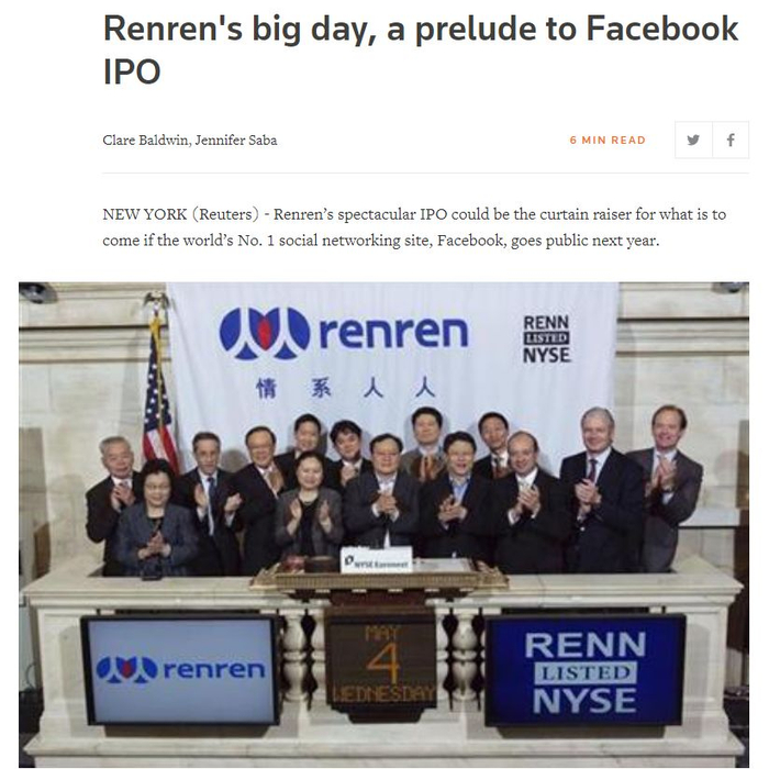 从界面到起家模式都在对标Facebook的人人网创办于2005年。2011年5月,人人网在纽约敲钟上市,但随后便以令人膛目的速度从巅峰滑落。到了2012年2月,人人网(NYSE:RENN)的股价就比发行价跌去三分之二,从此便一蹶不振。