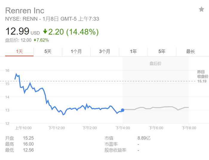 消息一出,截止北京时间1月8日晚9点,人人网在美股盘前一度大跌14.48%。