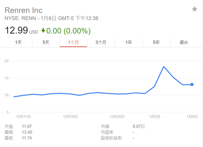 然而人人公司股票在大涨两日后又迅速回落。当时就有消息质疑称,该项目恐受到监管部门严格审查。而在受到约谈的消息传出前,公司股票已经跌至12.99美元,距最高点跌幅近28%,但仍高于新年开盘价。