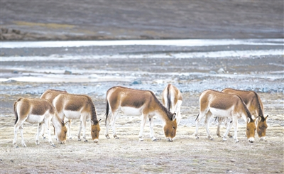 一群藏野驴在可可西里地区觅食(2015年5月20日摄)。